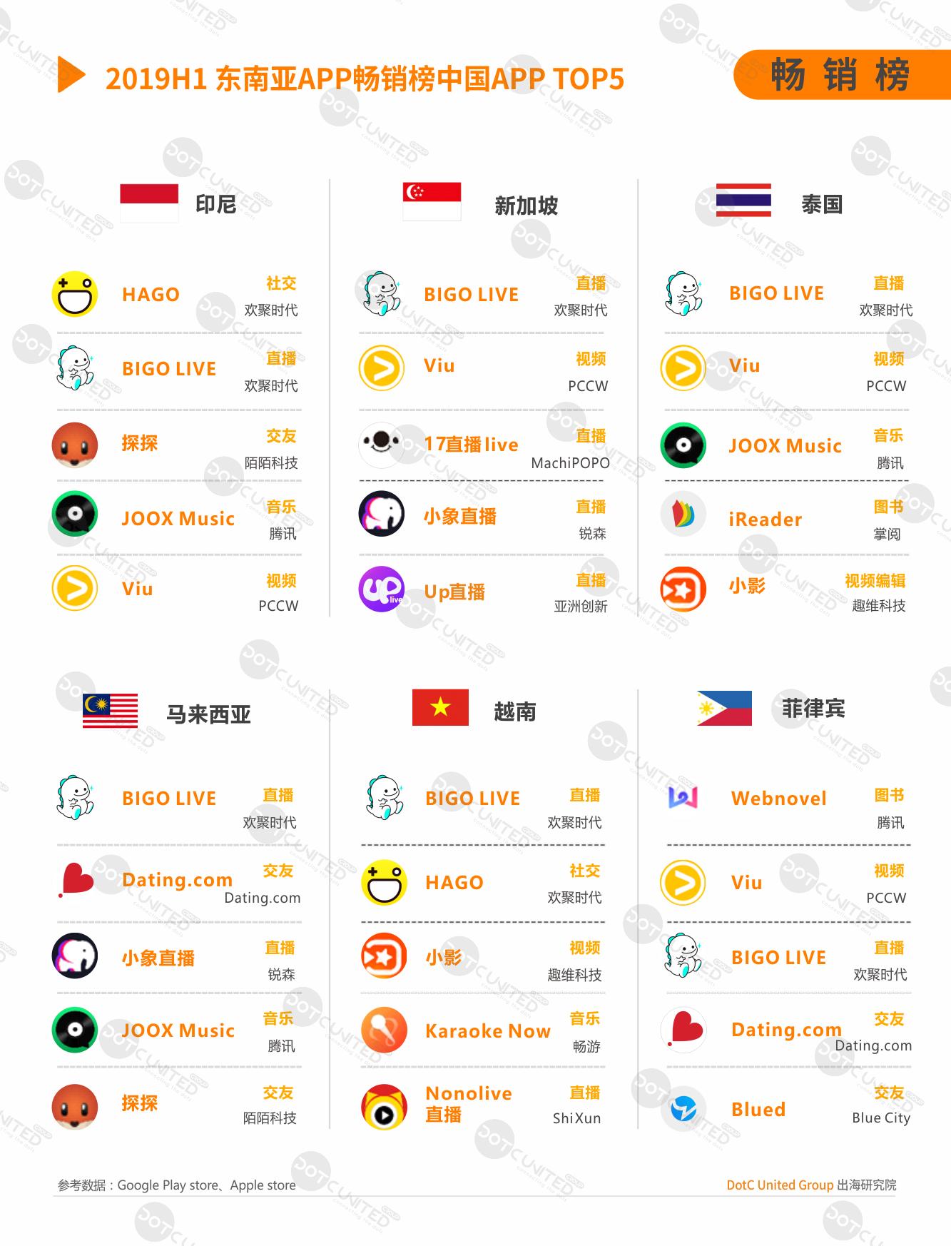 统计2019年上半年东南亚六国APP畅销榜中中国 APP TOP5 显示,整体而言,中国APP头部产品主要集中在直播、交友、流媒体服务(音乐&视频)类型,其中,直播 APP BIGO LIVE、游戏社交 APP HAGO 以及视频流媒体应用Viu是表现最好的三款产品。此外,新加坡 TOP5 中4款为直播产品,全球华人人口比例最高的新加坡用户对中国的直播产品情有独钟。