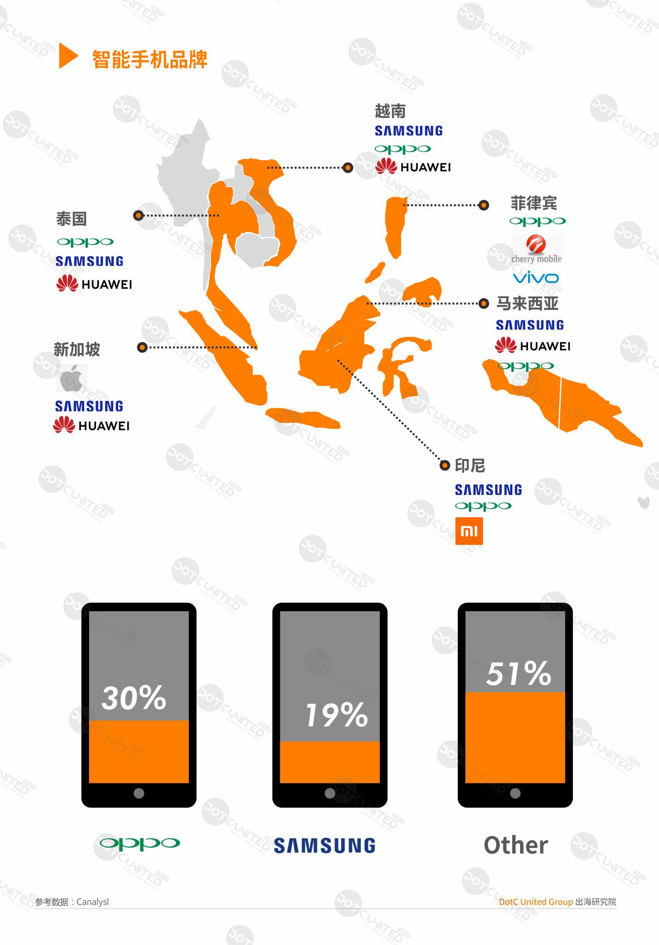 目前,在东南亚六国中,新加坡作为东南亚国家中唯一的发达国家,以高端机主导市场,苹果用户接近四分之一市场份额。除新加坡外,其他东南亚市场基本以三星、oppo 、华为、vivo 及小米等安卓手机为主。其中,三星和 oppo 合占整个东南亚手机市场约50%市场份额。对于在东南亚市场的 APP 分发,不论是手机预装或是应用商店分发,国内厂商可参考这些信息进行与相关手机厂商的合作。