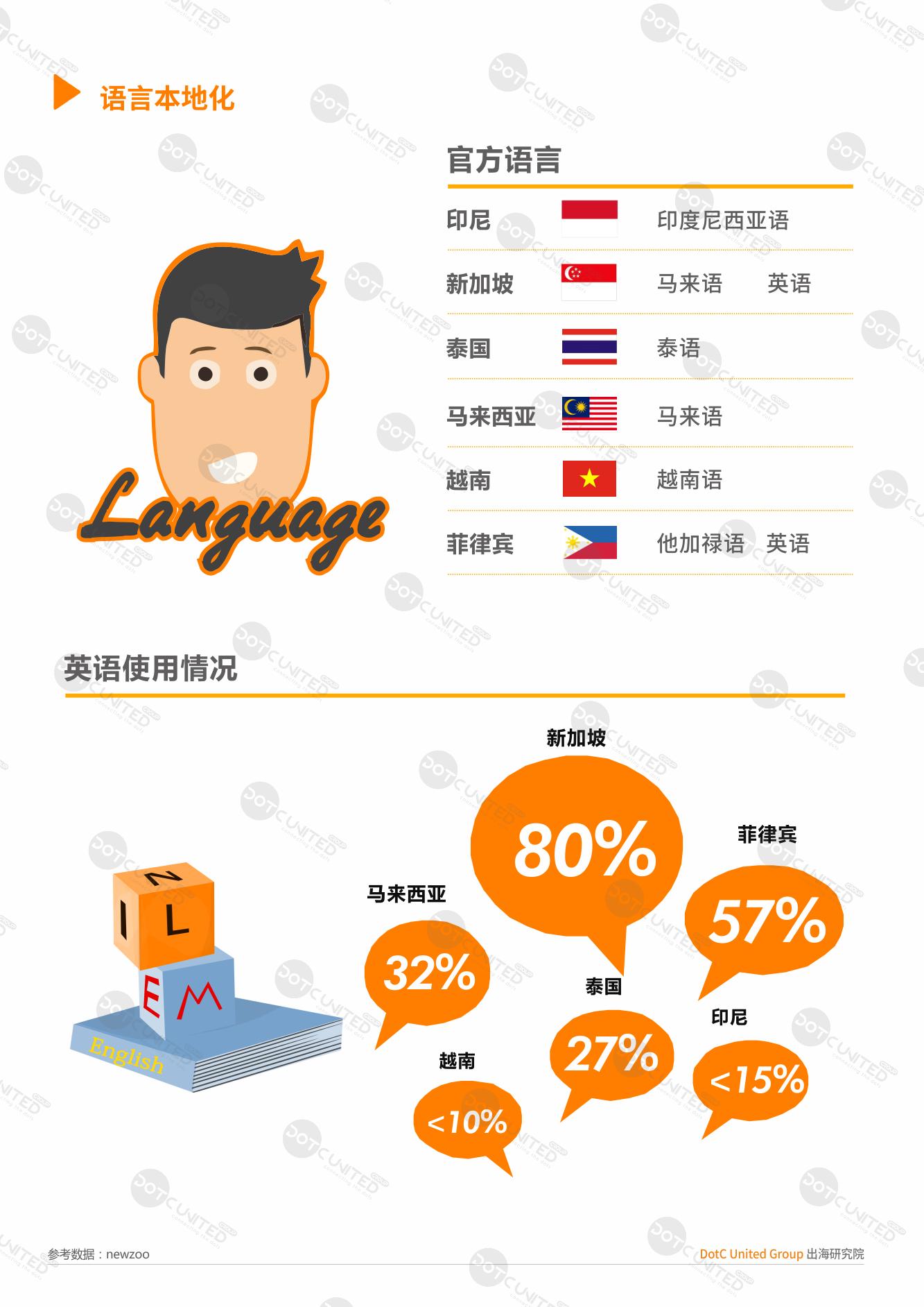 东南亚地区多民族多国籍人口聚集,包括官方、常用等语言繁多,除各国 母语外,英语在东南亚也有一定的使用率。新加坡英语使用率高达80%,在菲律宾这一比例也接近60%,对于这两个国家,英语也是其第二官方语言。而越南,印尼和泰国的英语使用率较低,均不超过30%。