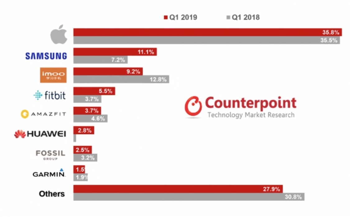 从Counterpoint发布的报告可以看出,即使没有睡眠功能,Apple watch的市场份额依旧是智能手表市场第一,足足是有带有睡眠功能的第二名的3倍有余。