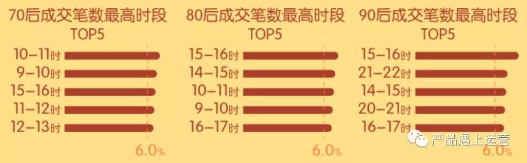上述数据在互联网运营上可以想到的做法是,可以为不同的品类设计不同类型的活动和导购,并且分配相应的线上资源。可以认为70后偏好的家居、家装、家电、酒类等品类的活动,设计上应该更加突出品牌,体现品质感,投放时间在白天为宜;85后更偏好的母婴、服装、黑科技潮品等品类应该突出折扣促销、网红推荐、爆款,以及品牌,投放时间在下午和傍晚;而95后更偏好的个性、快时尚、美妆类商品,则在活动设计上凸显主张与个性(是不是想起了“凡客体”?),在晚间投放。最后,老年人的保健、文玩、园艺等,在早上适当分配资源位,并充分发挥社交驱动打法。