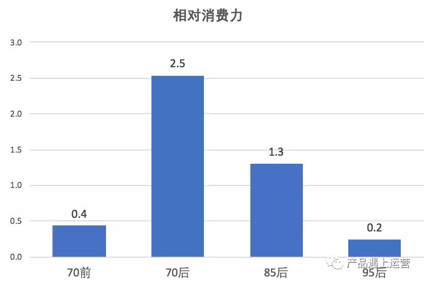 从这个数据可以看到,目前70~85这代人的消费能力处于绝对领先地位;85后的消费虽在迅猛增长但人均消费力比前一代人仍有近一倍的差距;95后开始逐渐走上工作岗位,拥有快速增长的收入,但包含很大的学生群体,消费力还相对不强。而70前由于相对节俭的消费习惯、较轻的家庭负担、和以养老、保健、旅游为主的消费内容,人均消费总体偏低。