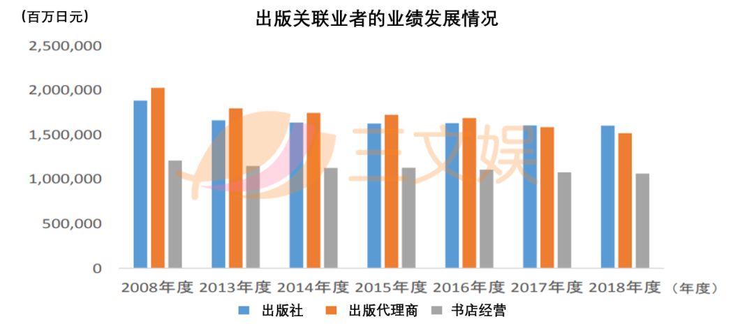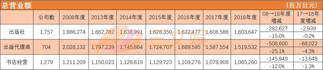 2018年日本3740家出版关联企业的营业额为41884.39亿日元,与10年前的51256.15亿相比,下降了18%,不容乐观。