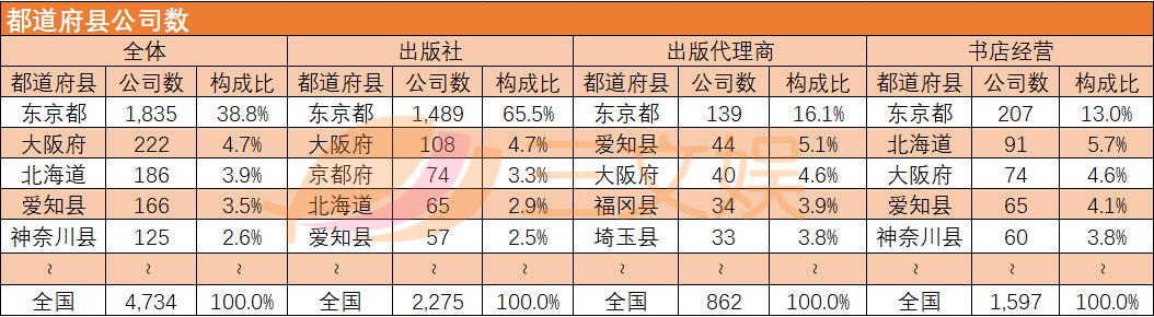 从这4734家公司的所属地域来看,出版关联企业在东京都的最多,达1835家,占比为38.8%。其次是大阪府,达222家,占比为4.7%。从三个业种来看,除东京都以外,出版社企业多分布在大阪府,出版代理商多分布在爱知县,书店经营企业多分布在北海道。