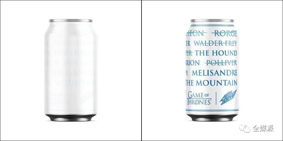 除了Doritos,越来越多的公司都加入了“反广告”(Anti-Ad)的行列,从营销物料中删除logo或品牌名称,以传达战略转变的声音。MTN Dew(激浪,百事旗下的一款碳酸饮料)今年与HBO合作,推出了一款白色、无品牌的限量罐装饮料,名为“A Can Has No Name(无名之罐)”,化用了剧中“无名之人”的梗,以此庆祝“权力的游戏”系列大结局。