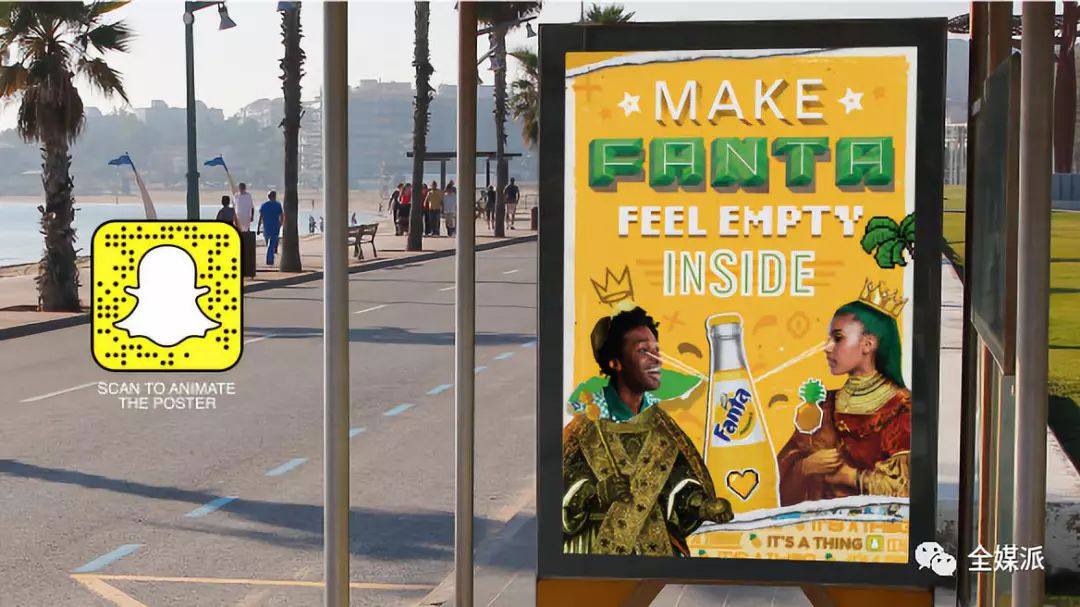 芬达和Snapchat有深度合作,Snap AR Marker Tech技术让用户可以更深层次地参与、定制和共享内容。粉丝们可以用手机的Snap扫描户外广告海报使它“动起来”,并探索特定口味芬达的AR世界,扫描Snapchat二维码还可以解锁各种滤镜和AR贴纸包。