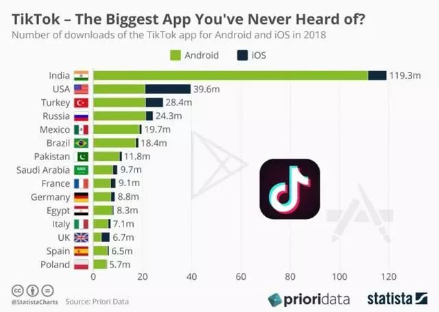最近几年,尽管从微信、支付宝到茄子快传、猎豹移动等产品都在强攻海外市场,快手、YY等公司在南美市场快速增长,但目前来看,抖音海外版Tiktok算是中国互联网出海比较成功的一个项目,抖音短视频在美国本土、新加坡、日本、韩国等亚洲国家下载排名方面逐渐与Facebook旗下的nstagram并驾齐驱。