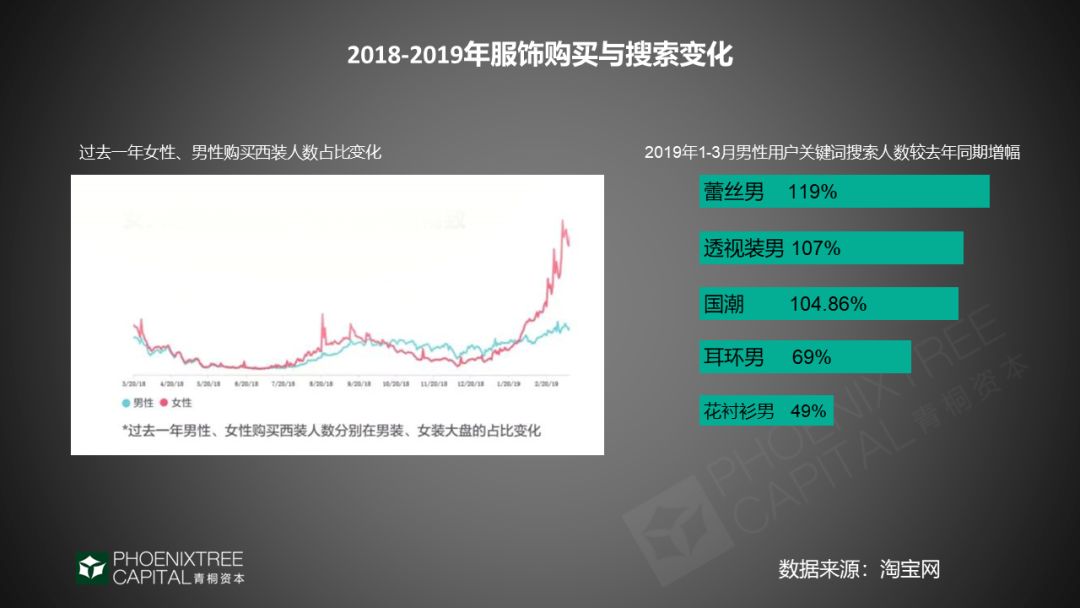 女性越来越酷,男性越来越精致。淘宝数据,2019年以来女性购买西装的人数比率已大幅超越男性,而男性对于透视装、蕾丝等词汇的搜索量也有了较高增幅。在女装搜索关键词中,“宽松”成为了常见词;男装搜索的常见词则为“潮”。