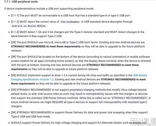 在这种情况下,谷歌偏偏相中了USB PD的原因其实很简单,因为其也是这一标准实实在在的利益相关方。尽管USB PD是USB-IF(USB标准化组织)制定的标准,但谷歌对于这一协议可以说是非常的上心,不仅在自家的Pixel系列上率先应用,更是早在2016年末的Android 7.0的兼容性定义文档中,就曾建议手机厂商在新设备对其进行兼容,并警告称未来不排除将“建议”变成“要求”。