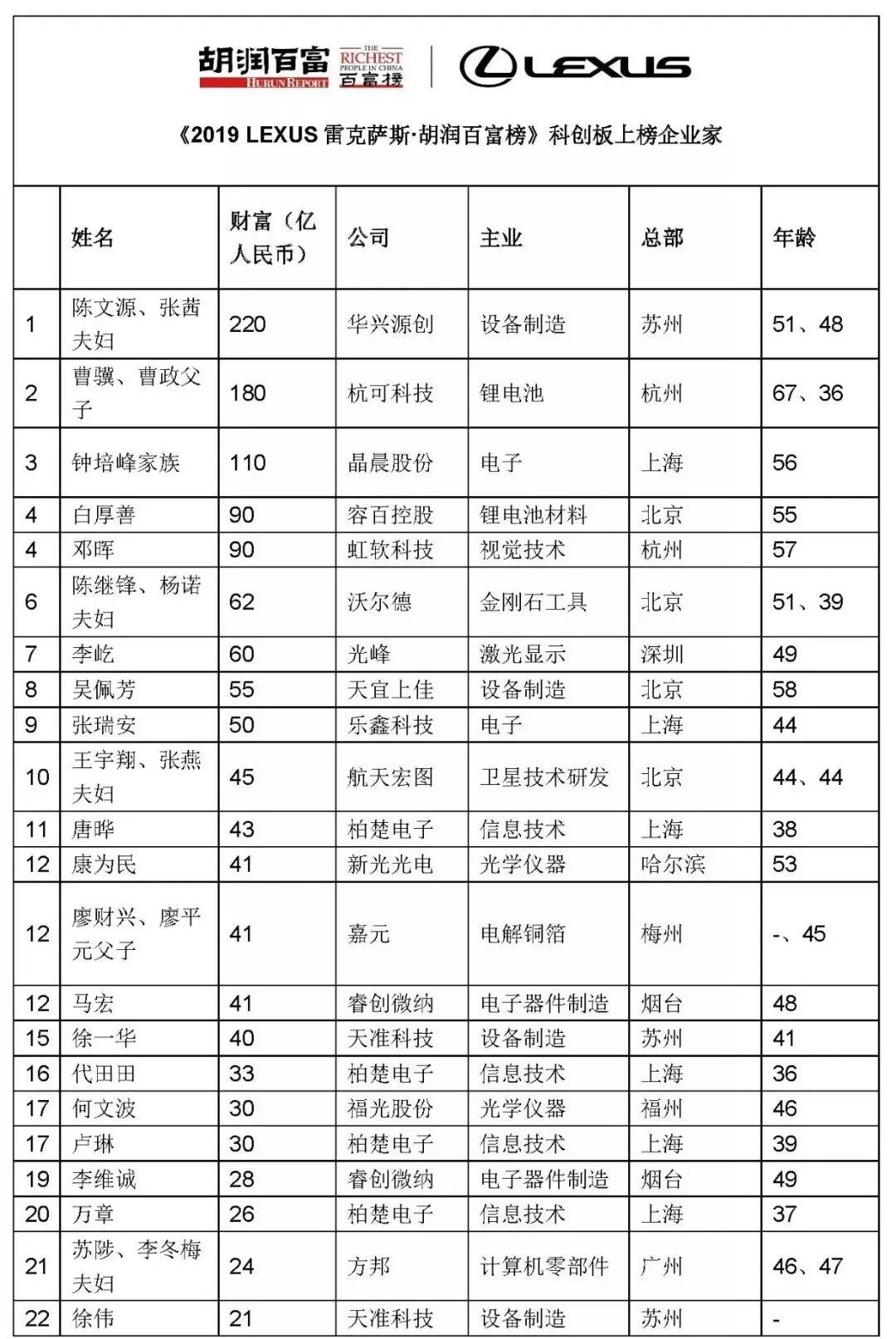 其中,平板检测设备企业华兴源创的陈文源、张茜夫妇以220亿元成为科创板首富,其次是锂电池设备制造商杭可科技的曹骥、曹政父子,财富180亿元。