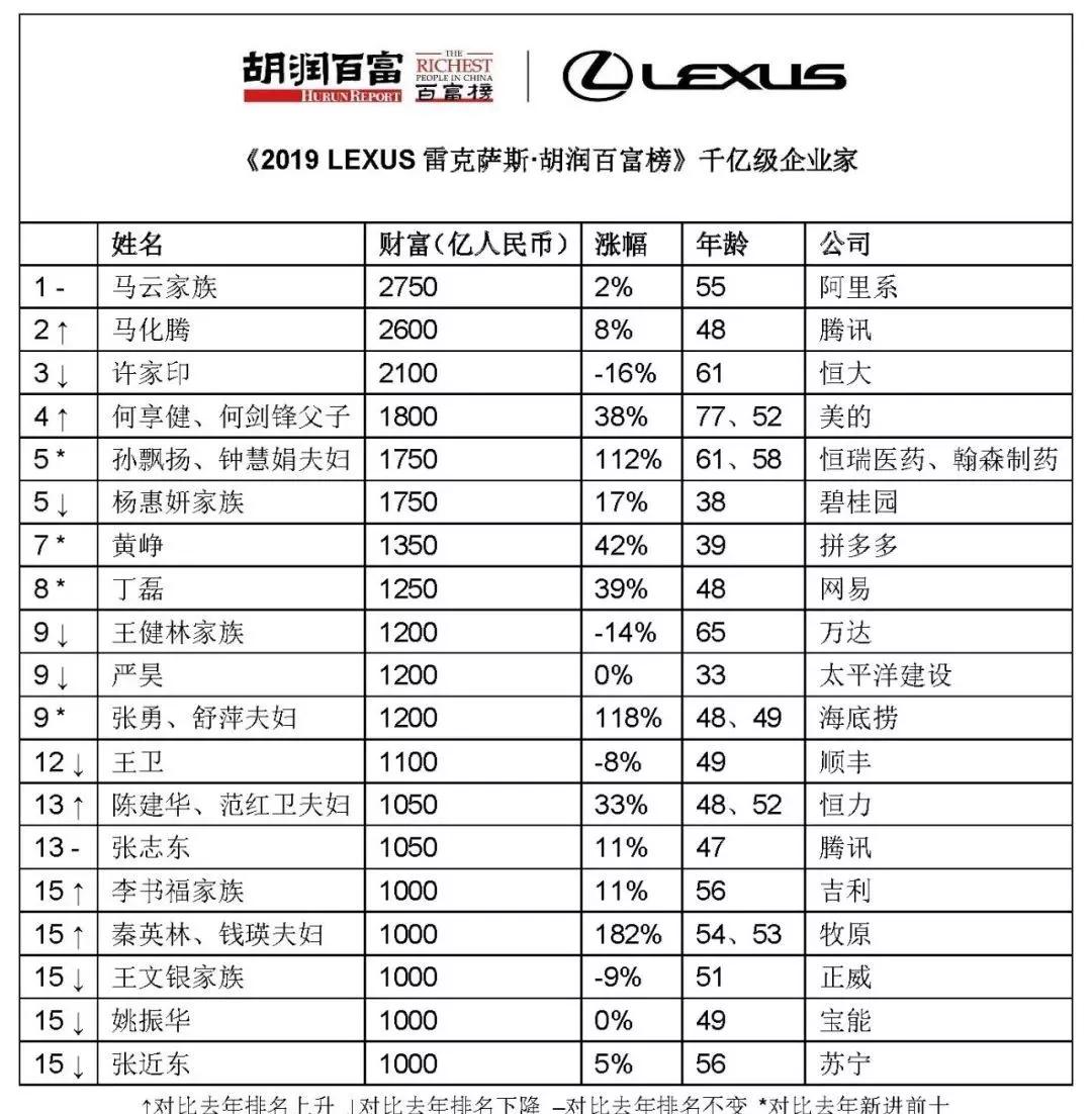 同时,今年首次有医药行业的企业家进入榜单前十位,来自恒瑞医药和翰森医药的孙飘扬、钟慧娟夫妇今年以1750亿元的财富数字排名榜单第5位。