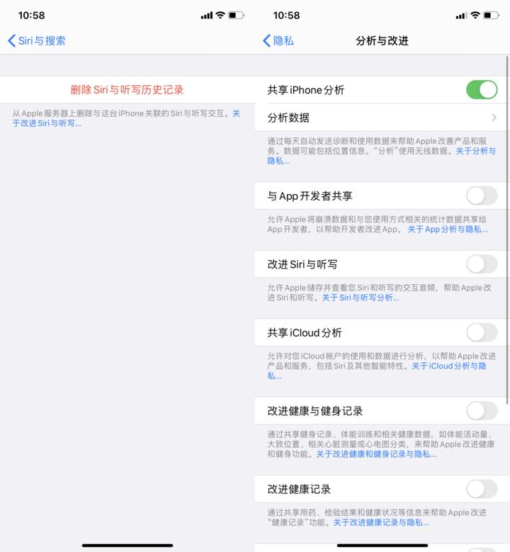 系统更新后的新选项界面,可以选择不共享 Siri 音频数据