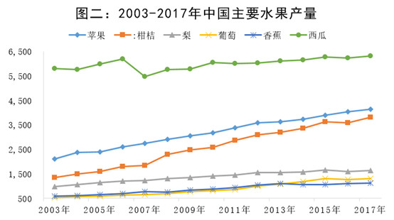 见图二,自2003年起,我国水果的增量主要来自于苹果、柑橘,原因是保质期长,可以对比西瓜、梨、葡萄、香蕉、桃、杏等等。水果有“季产年销”的特点,保质期长是保证全年供应的关键因素,在北方冬天,一箱苹果放在窗外可以保存半年,苹果在耐贮性上完胜,成为西瓜外的第一大水果。
