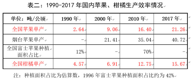 由于苹果树不耐热、柑橘树不耐寒,两种水果的主产省份以长江为界,北苹果、南柑橘。由于保质期长,规模空前的鲜食水果市场选择了苹果、柑橘,同理,也为生产端提质增量创造了有利条件,见表二,时至今日,苹果、柑橘的生产效率一直在提升。
