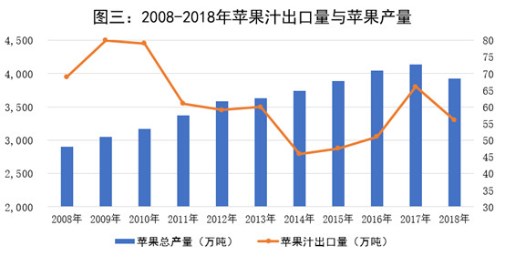 如图三所示,2008年以来,苹果产量连年攀升,苹果汁出口量却止步不前,甚至呈现下降趋势,全行业开工率下降,足以佐证上述判断。