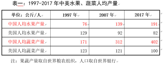 中国是世界第一大水果、蔬菜生产国,2017年,水果产量2.65亿吨,是美国的10倍;蔬菜年产量5.57亿吨,是美国的17倍,见表一,我国人均果蔬消费量远超美国。难道是美国老百姓太穷了,吃不起新鲜水果、蔬菜吗?