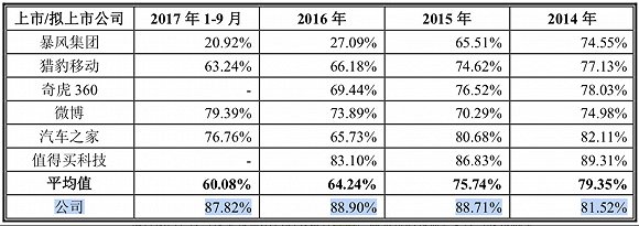 风险提示指出,2014 年、2015 年、2016 年和 2017 年 1-9 月,发行人互联网广告信息服务收入占比分别为 94.84%、98.12%、98.99%和 98.86%。