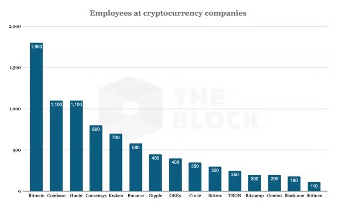 从图中统计的时前15名知名区块链公司的雇员情况,交易所占9席。其中Coinbase和火币人数最多为1100人;其次Kraken700人,币安 580人,OKEx 400人,Bittrex 300人,Gemini200人,Bitfinex为110人。