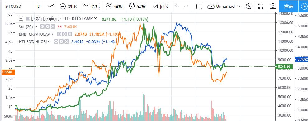 其中绿色线为BTC价格走势,橘色线为BNB价格走势,蓝色线为HT价格走势。
