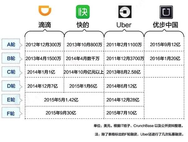 2015 年 7 月,滴滴快的宣布完成 20 亿美元 F 轮融资,而这距离其 1.42 亿美元 E 轮融资仅过去两个月。9月,滴滴快的再次宣布,F 轮融资加入了新的投资者,20 亿美元变成了 30 亿美元,估值上升至 165 亿美元。同一个月,Uber 在中国的独立注册公司雾博也完成了 12 亿美元 A 轮融资。2016年 1 月,优步中国又完成了约 20 亿美元 B 轮融资。