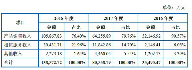 2016-2018年,公司总营收分别为3.5亿元、8亿元、13.8亿元。2017、2018年营收分别较上年增长126.96%、72.01%。其中,销售业务占总营收比重最高,年均约为82%;租赁收入占总营收比重年均约为14%;其他收入占比年均约4%,主要包括技术服务和安装。
