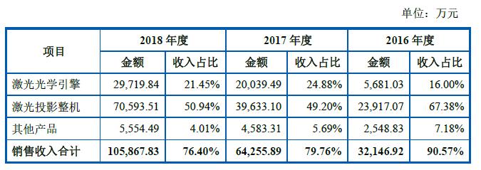 销售产品包括激光光学引擎、激光投影整机及其他产品。2016-2018年,销售收入占主营业务总营收比重分别为90.75%、79.76%、76.40%。其中,激光投影整机占营收比例最大,目前,公司的激光投影整机的应用领域包括电影、电视、商教及工程。2016-2018年激光投影整机营收占总销售额比重最大,分别为67.38%、49.20%、50.94%。营收下降主要原因是,激光商教投影机收入下降(由于市场竞争充分且政府及教育机构采取招标的形式采购形成价格竞争,导致终端价格下降)。此外,激光光学引擎包括激光光源及激光电视光机。2016-2018年,公司激光光学引擎营收占总销售额分别为16%、24.88%、21.45%,该业务增长较高主要原因是2017年公司激光光源产品销量增加。