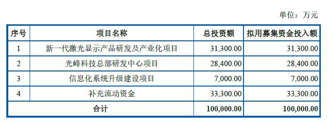 为保证公司产品的市场竞争力,根据招股书,光峰科技此次募资金额为10亿元,其中用于科技创新领域的募集资金合计66,700万元,占总募资金额的66.7%,包括新一代激光显示产品研发及产业化项目中的研发、光峰科技总部研发中心项目、信息化系统升级建设项目。其余的33,330万元补充流动资金将用于人员招募及加强软硬件建设等。