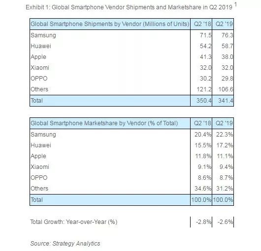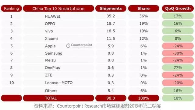 就全球市场范围来看,三星销量仍居榜首。以2019年第二季度数据为例,三星销量7630万台,华为销量为5870万台,苹果为3800万台。但具体到中国市场,Counterpoint的调研数据显示,2019年第二季度,三星手机中国市场份额为1%、出货量为80万台。作为对比,华为同期出货量为3520万台。