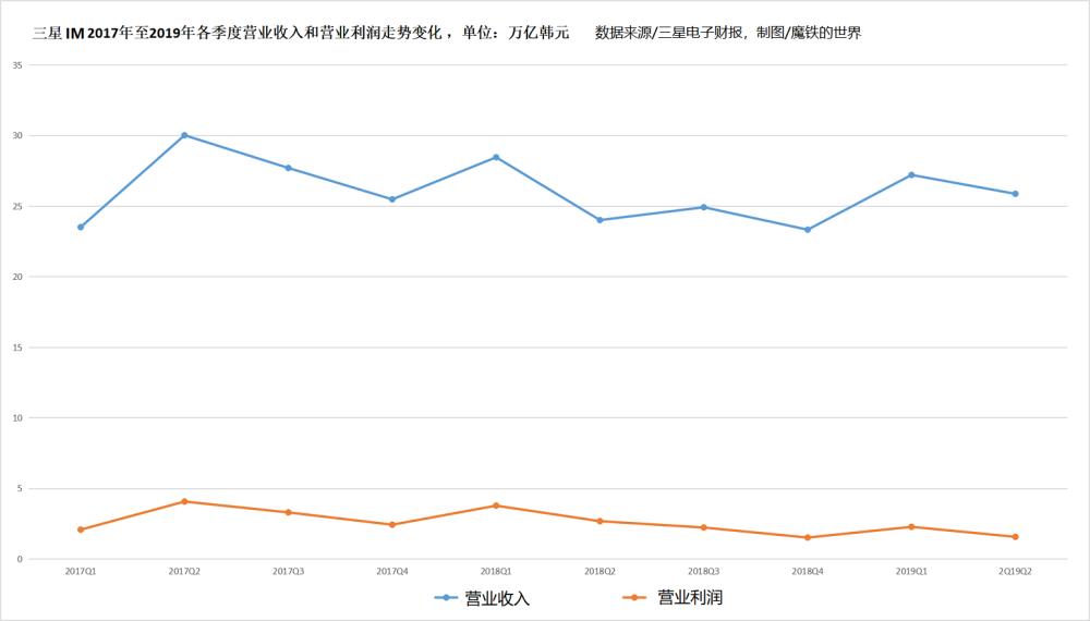 按季度比较以手机为主打的IM部门近年的营业收入和营业利润,就不难发现一些变化:从2018年第1季度到2019年第2季度,营业收入起起伏伏,大体稳定,没有明显的下降或上升,但营业利润却逐渐下降;2018年第3季度相对于第2季度,营业收入增加大约3.8%,但营业利润却跌了17%,而2019年第2季度表现更为明显,营业收入跌了5%,营业利润却大跌31.3%;到了2019年上半年(一、二季度),三星交出了最差成绩单,营业收入增长8%,营业利润却同比大跌41%。