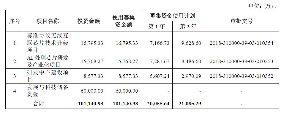 基于产品定位及目前公司面临的挑战,乐鑫本次拟募资101,140.93万元。除去6亿元发展与科技储备资金,标准协议无线互联芯片升级项目及AI处理芯片研发及产业化项目募资所占比重最高,约32.2%。这两个项目的主要目的都是为了提升芯片性能和核心技术指标,拓展产品应用领域,丰富产品品类。