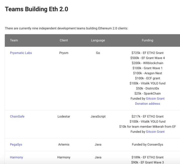 以 ETH 2.0 client 为例 ,同时有 9 个团队在进行平行开发:https://docs.ethhub.io/