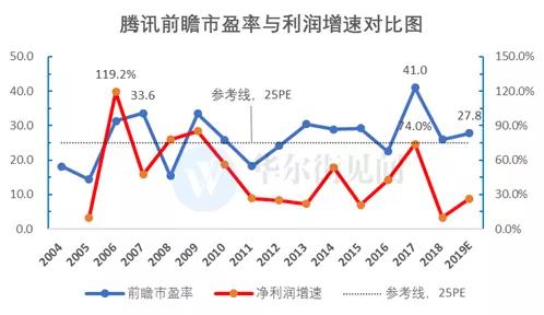 从上图看,腾讯的估值及业绩增长呈现两大特征: