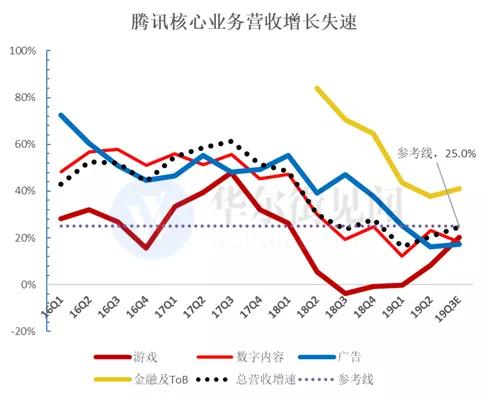 腾讯市值的高点和主营业务增长的实际峰值几乎完美对应。如下图所示,自2018年Q2起,腾讯各条核心业务线营收增速均从峰值回落,整体营收增速在2019年Q1同比降至20%以下。
