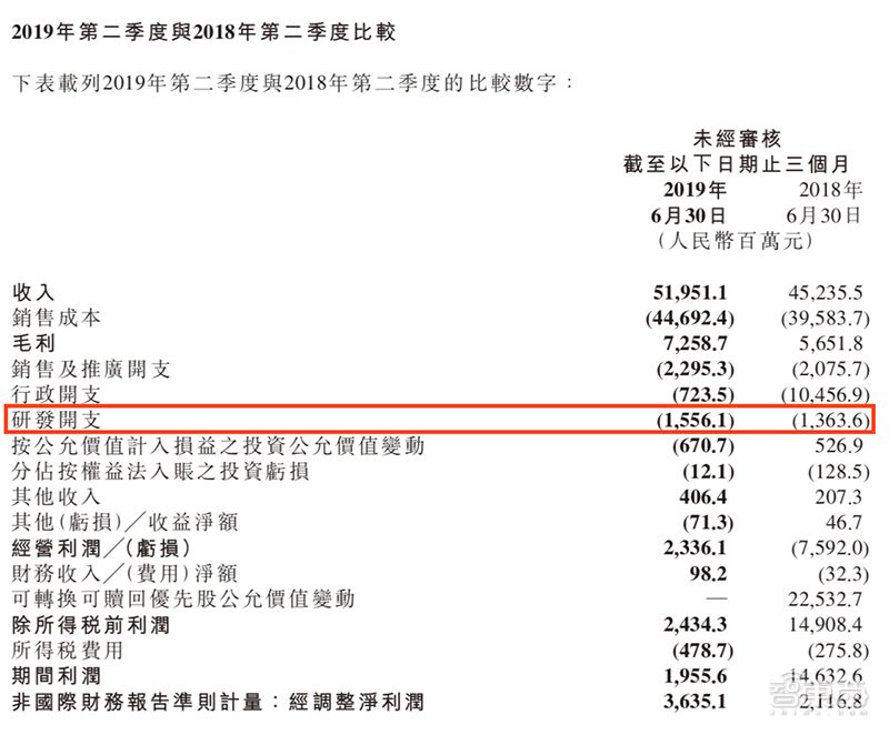 时间再往后推,小米2019年第二季度的研发开支约为15.56亿人民币,环比降低5.7%,同比增长14.1%。而这一季度小米的营收为520亿人民币,研发投入占比3.08%。