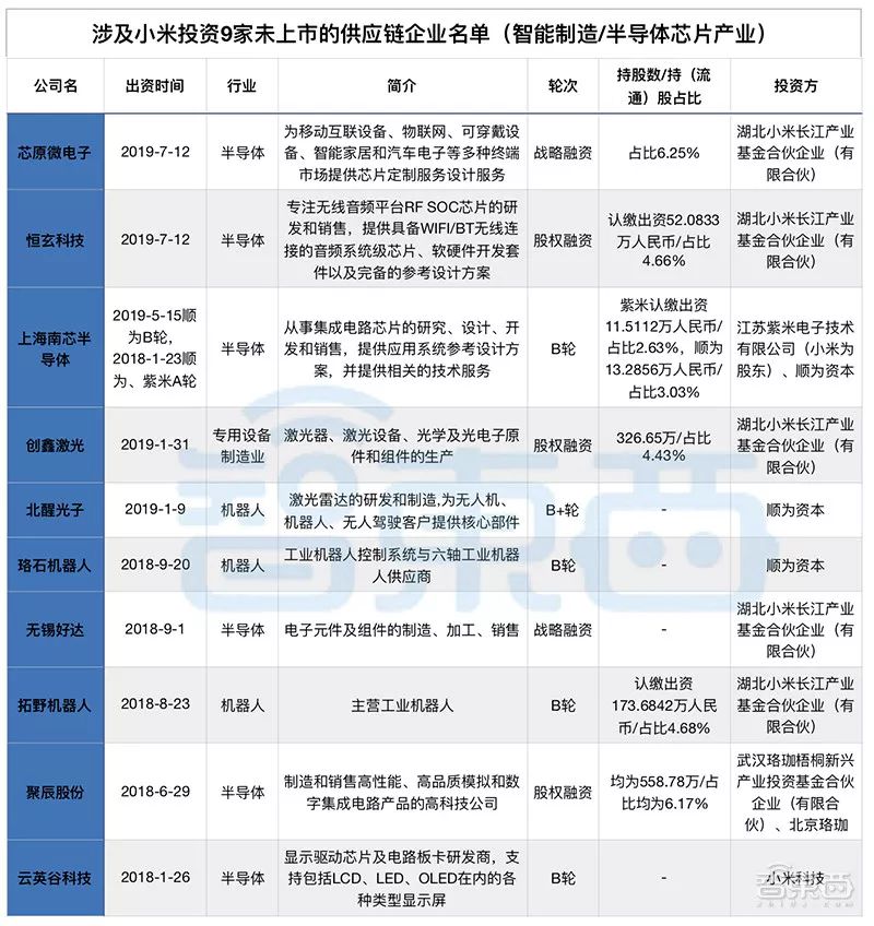 至于剩余9家企业,智东西则进一步梳理了小米集团两年内的相关投资,经分析后初步判定应在以下10家企业中。
