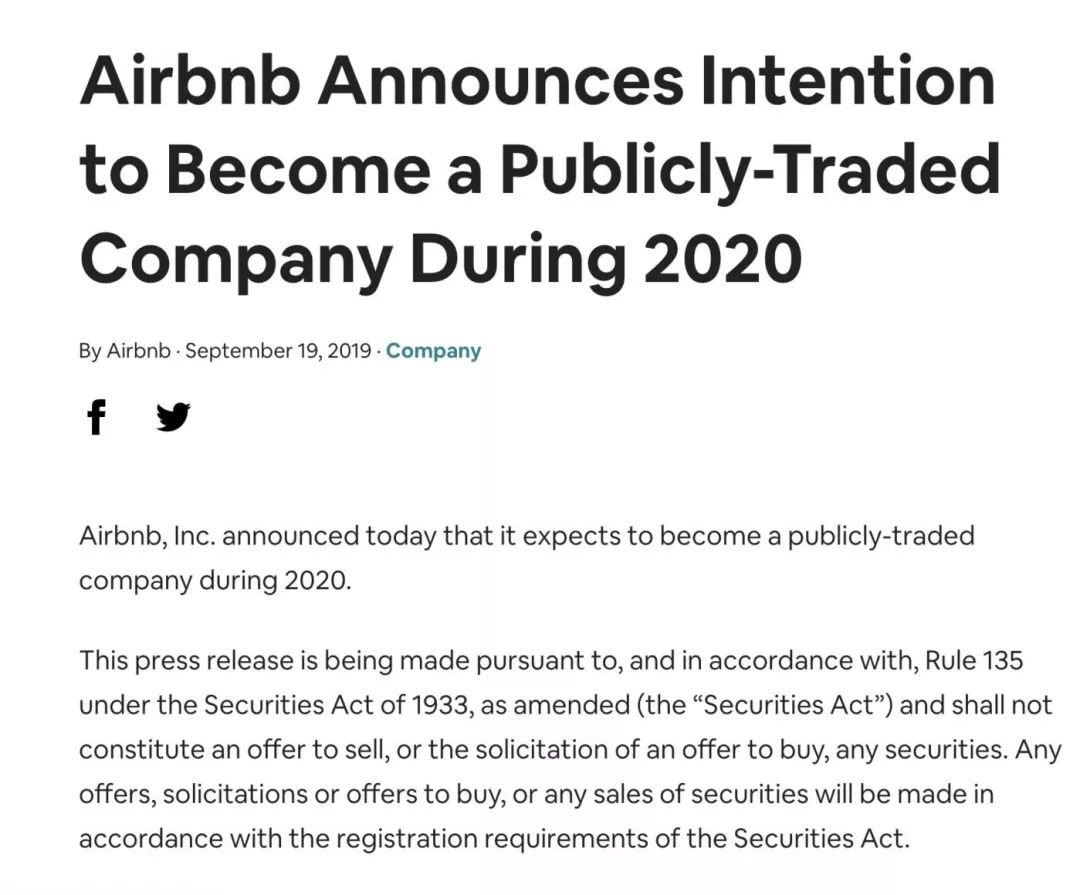 在这样的背景下,共享民宿巨头 Airbnb 在 9 月 19 日发表声明称,公司将在 2020 年上市。