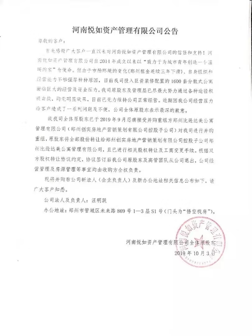 同时,在这份通告中也表示,在2019年9月郑州比逊达美公寓管理有限公司(郑州创实房地产营销策略有限公司控股子公司)已对悦如公寓进行并购重组,全部股份已经转让给对方,且已进行了相关股权转让及员工工商变更手续。在全部变更协议生效后,公司经营管理及房源管理等均由收购方全权负责。
