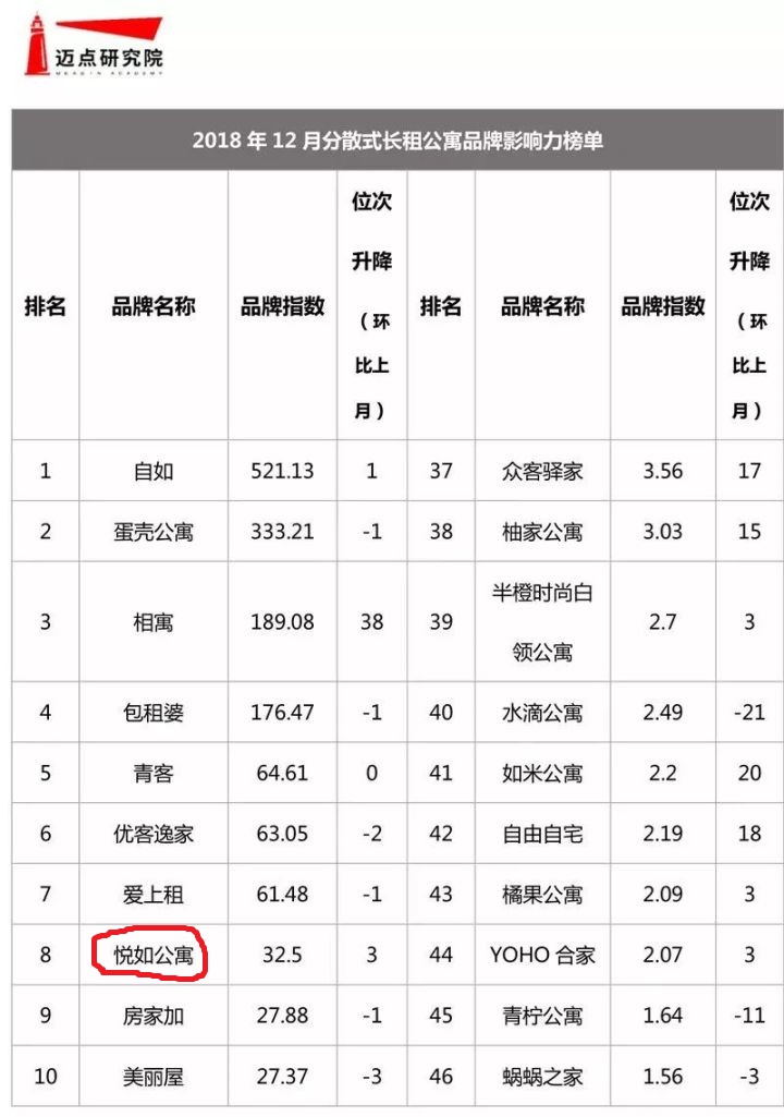 悦如公寓创立于2014年2月,定位于为客户提供品质公寓产品和超越期望服务。曾在2018年12月迈点研究院发布的“分散式长租公寓品牌影响力榜单”中排名第8。