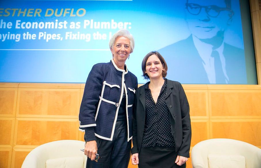 前IMF总裁拉加德对埃斯特·迪弗洛获奖表示恭喜,并在社交媒体上公布2016年迪弗洛在IMF总部演讲时的合影