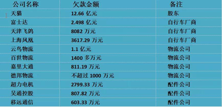 除了股东,ofo也欠上游自行车厂商、物流公司、配件公司等超过3亿元。