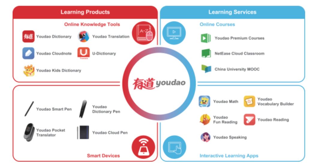 招股书显示,网易有道的核心业务主要由4部分构成:一、在线学习工具,包括有道词典、有道翻译、有道云笔记等;二、智能硬件,包括有道翻译王、有道智能笔、有道词典笔等;三、在线课程,包括有道精品课、网易云课程、中国大学MOOC等;四、交互式学习应用,包括有道数学、有道背单词、有道乐读等。