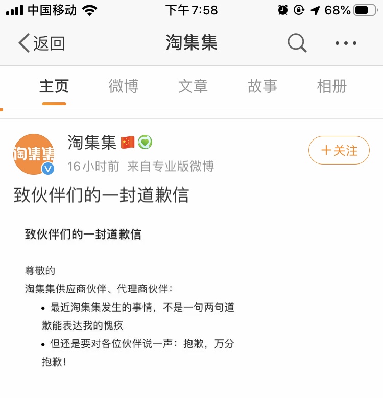 淘集集致歉信