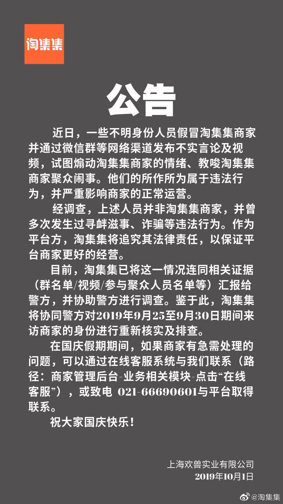 淘集集发布的公告