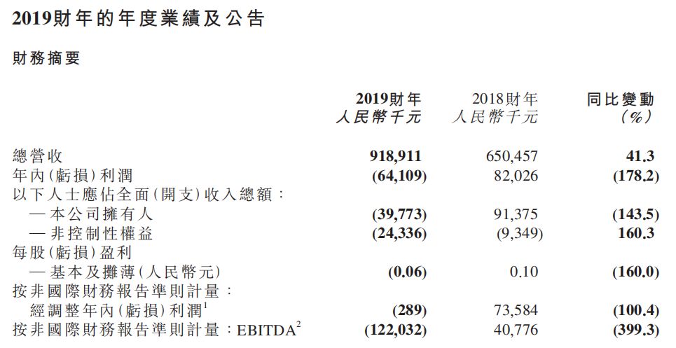截至2019年5月31日总营收为9.19亿元,同比增长41.3%;净利润由去年同期盈利8202.6万元,变为亏损6410.9万元,下滑幅度为178.2%;经调整净亏损28.9万元,去年同期盈利7358.4万元,下滑幅度超100%。