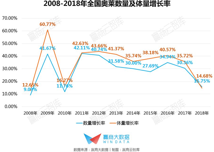2008年至2018年,全国奥莱总数量的年均增长率为31.6%,总体量的年均增长率为38.2%,整体发展上行。