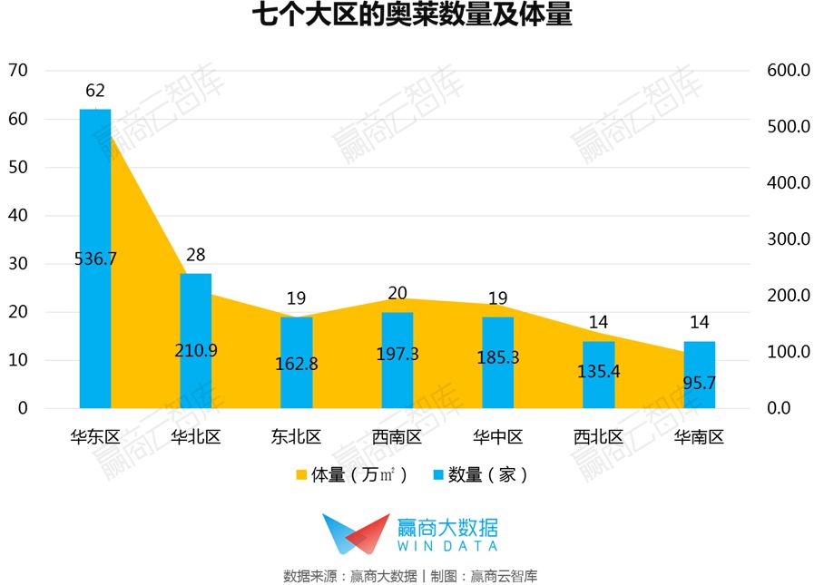 在区域分布上,奥莱业态呈现不均衡的态势。据赢商大数据监测,截至2019年9月底,全国奥莱存量最高的为华东区,共有62家奥莱,体量超过530万㎡,占比达35.2%;其次为华北区,奥莱共28家,体量为210万㎡,占比为13.8%;西南区奥莱存量排名第三,共20家,体量占比11.4%。