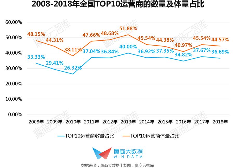 2008年至2018年,TOP10奥莱运营商占全国总数量的比例由33.3%升至36.7%,体量占比则由最初的48.1%微降至44.6%。其中,2008年至2010年,TOP10运营商的占比有所下降,但在2011年至2018年间缓慢上升和波动,整体来看,行业集中度呈“稳中攀升”走势。