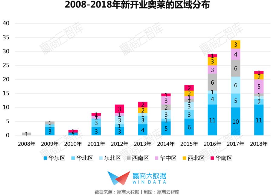 观察十年间新增奥莱的区域分布,可以看出,华东区一直是新开业奥莱的主力区,地位稳固;华北区在2015年至2017年间增长较多,2018年同比下降;东北区和西南区整体发展相对滞后。近三年来,西南区和华中区的新开业奥莱数量大幅上升,属于奥莱新兴发展的区域。