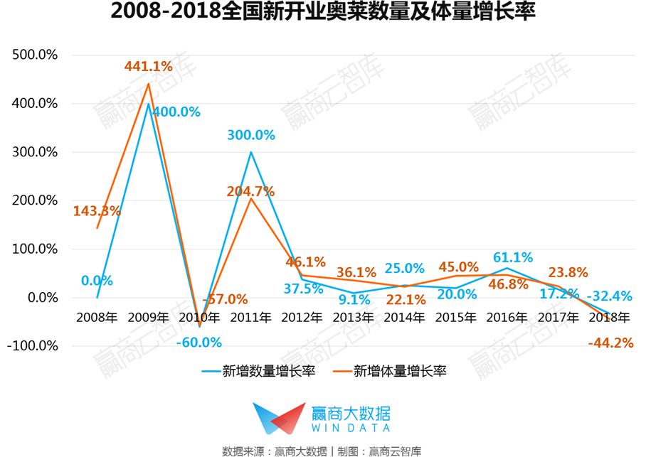 2008年至2012年,由于市场尚未培育成熟,入市开发商尚少,新开业的数量及体量增长率波动较大;2012年至2017年,新增数量及体量的增长率在10%至80%之间;2018年如上分析,新增数量及体量皆大幅锐减,增长率为负数。
