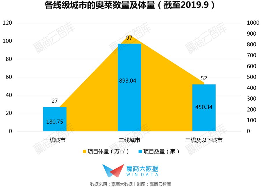 据赢商大数据监测,目前一线城市的奥莱共27家,体量超过180万㎡,占比约12%;二线城市共97家,体量为893万㎡,占比58.6%;三线及以下城市共52家,体量为450万㎡,占比29.5%。